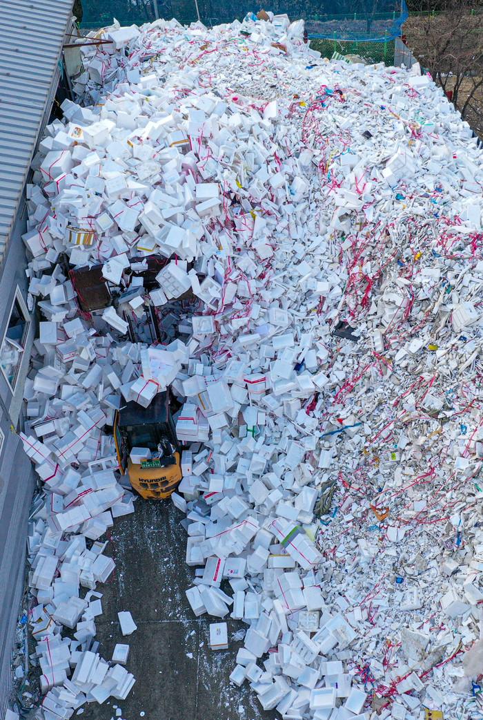 15일 오후 경기 수원시 영통구 수원시자원순환센터에서 관계자들이 설 연휴가 끝나고 쏟아져 나온 스티로폼을 정리하고 있다.