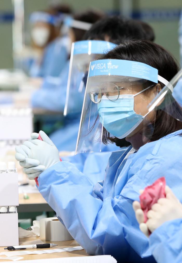 17일 오전 강원 춘천시 봄내체육관에서 보건당국 관계자가 지역내 사회복지시설 종사자들의 코로나19 검사를 진행하던 중 핫팩으로 손을 녹이고 있다.