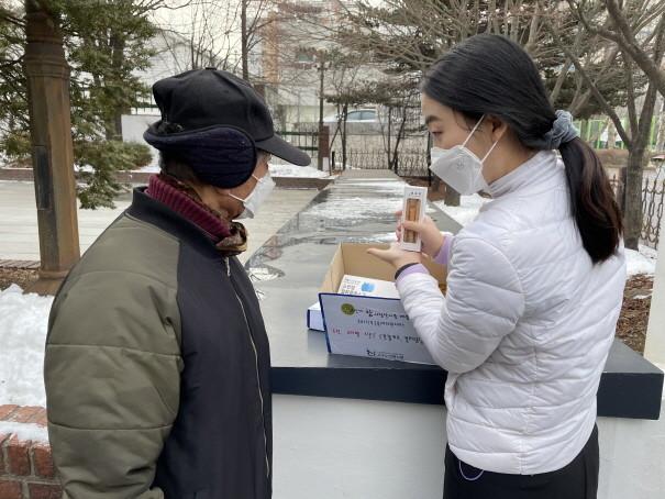 인천 서구 노인복지관이 8일 코로나19와 추위로 야외활동이 어려워진 150여명의 노인을 위해 나만의 달력 만들기, 마스크, 손 소독제 등으로 구성된 ‘노인 맞춤형 취미·건강키트’를 제작해 배부했다. 사진은 도서관 관계자가 한 노인에게 키트를 전달하고 있는 모습. (사진제공=인천 서구청)