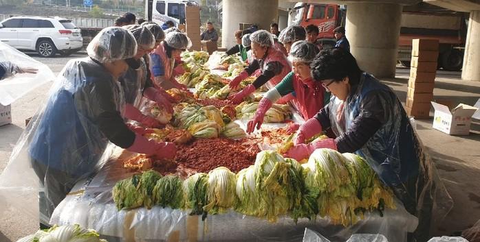 경기 남양주시 퇴계원읍 새마을지도자협의회와 새마을부녀회는 지난 10일 사랑의 김장 나눔 행사를 개최했다. 이날 담근 김장 1000포기는 지역내 어려운 이웃 200가구와 경로당 23곳 등에 전달됐다. 사진은 김장을 하고 있는 모습. (사진제공=남양주시청)