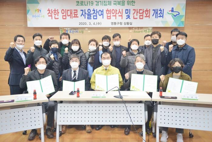 경기 수원시 영통구는 4일 지역내 상인회 대표 및 건물소유주와 함께 코로나19 여파로 어려움을 겪고 있는 소상공인을 위해 ‘착한임대료 자율참여 운동’ 협약식을 개최했다. 사진은 협약식에 차석한 송영완 구청장(가운데) 및 관계자들이 기념촬영을 하는 모습. (사진제공=영통구청)