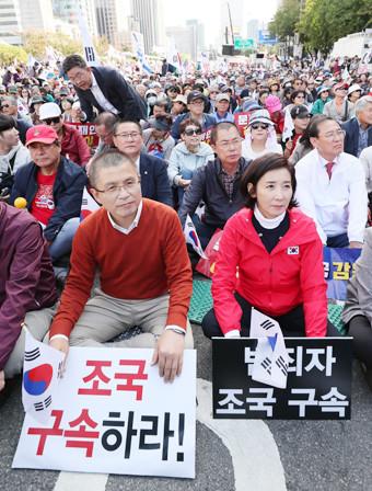 자유한국당 황교안 대표와 나경원 원내대표가 9일 오후 서울 광화문광장에서 범보수단체 주최로 열린 조국 법무부 장관 사퇴 촉구 집회에 참가하고 있다. /연합뉴스