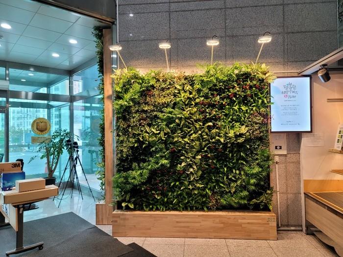 효율적인 공간 이용을 위해 본관 출입구 중심으로 산호수, 천양금, 파초일엽, 테이블야자 등 6종의 녹화식물을 도입해 미세먼지 제거 및 공기정화 효과를 다양한 녹색 경관으로 조화롭게 연출했다.