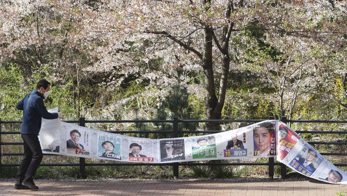 8일 오전 서울 진관동주민센터 관계자들이 은평뉴타운 벚꽃길 주변에 붙어 있던 선거벽보를 제거하고 있다.