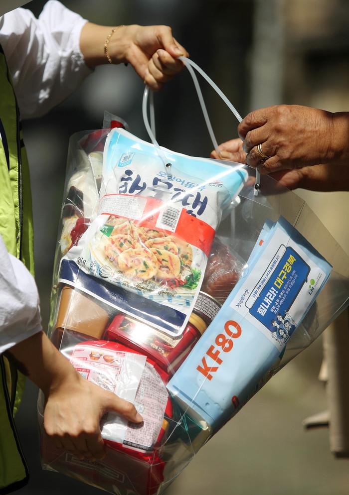 15일 대구시 서구 원대동 일대에서 서구제일종합사회복지관 관계자가 지역내 홀로 사는 노인을 찾아가 식료품과 생필품을 전달하고 있다. 복지관 측은 추석을 맞아 코로나19 감염 우려로 외출이 어려운 저소득 가정, 홀몸노인 등 300여가정을 직접 찾아가 마스크와 식료품 등으로 구성된 한가위 복 보따리를 지원하고 있다.