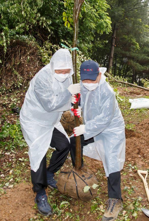 | ▲ 지난 27일 부엉이근린공원에서 '1기업 1공원 가꾸기' 업무협약 후 진행된 식수 행사에서 유동균 구청장(왼쪽)과 안흥국 사장이 나무를 심고 있는 모습. (사진제공=마포구청) |