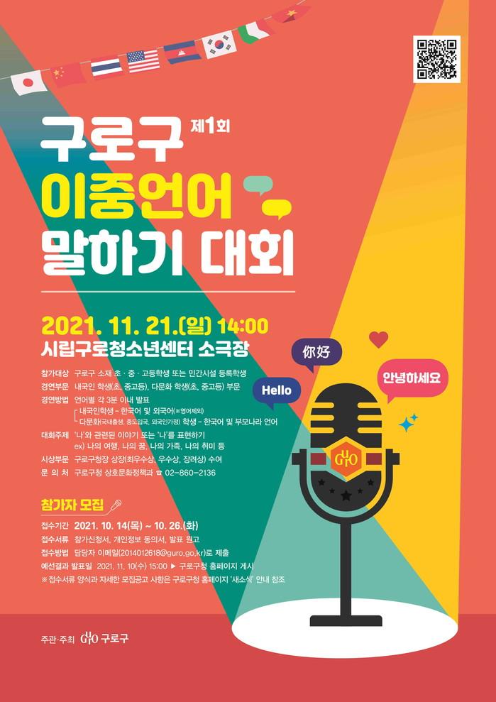 [시민일보 = 이대우 기자] 서울 구로구(구청장 이성)가 내외국인 학생들의 언어교류 장을 위한 ‘제1회 이중언어 말하기 대회’ 참가자를 오는 26일까지 모집한다.