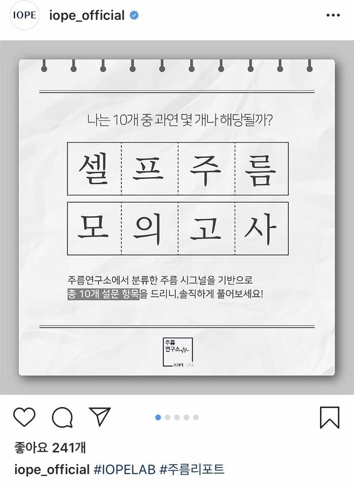아이오페는 최근 공식 SNS에 ‘주름연구소’ 이벤트 방문자들을 대상으로 실시한 주름 고민 관련 설문조사 결과를 토대로 만든 ‘주름 리포트’를 올렸다.