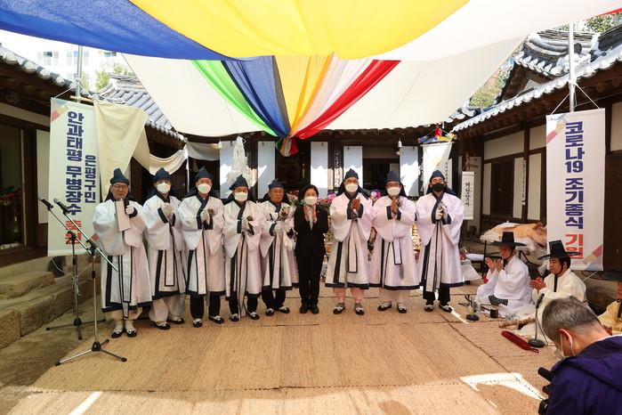 서울 은평구는 최근 금성당(진관동)에서 대한민국의 태평성대과 지역주민의 무명 장수를 축원하고, 코로나19가 하루빨리 종식되길 소망하는 2021년 금성당제 행사를 개최했다. 사진은 이날 김미경 구청장(가운데)이 행사 관계자들과 기념촬영을 하는 모습. (사진제공=은평구청)