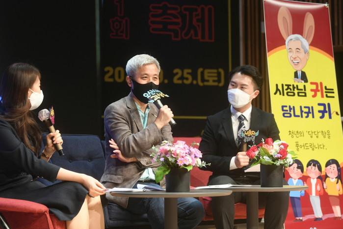 경기 오산시가 지난 25일 ‘제1회 오산청년 하이 축제’를 온라인으로 개최했다. 축제는 청년 유공 표창을 포함한 기념행사와 만들기, 기부 프로그램, 토크 콘서트 등 다양한 프로그램으로 진행됐다. 사진은 토크 콘서트에서 곽상욱 시장(가운데)이 청년들과 소통하고 있는 모습. (사진제공=오산시청)