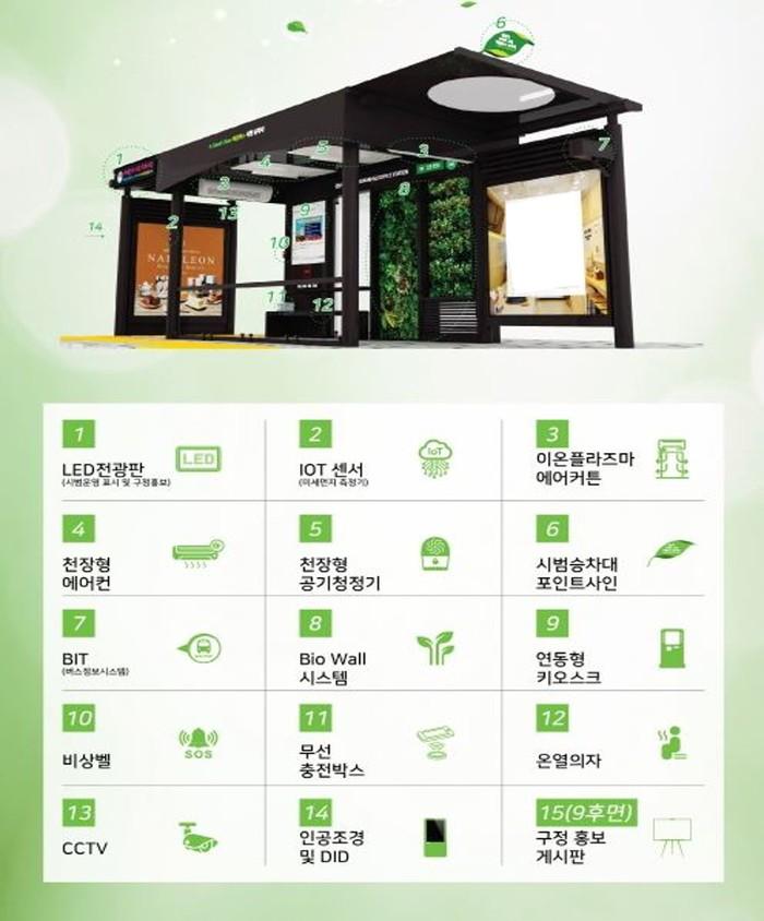 오금로 중앙차로버스정류소 상에 설치될 스마트쉘터 1곳은 ▲태양광 지붕과 LED전광판 ▲에어컨 ▲공기청정기 ▲온열의자 등 등 다양한 기능을 담아 이용자의 편의를 높였다.