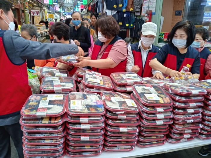 인천 서구자원봉사센터는 코로나19 장기화 및 무료급식소 중단 등으로 인해 발생할 수 있는 생활 취약계층의 결식 예방을 위해 농협, 신세계 등의 지원을 받아 취약계층에 도시락을 지원하는 ‘안녕한 한 끼 드림’ 사업을 펼쳤다. 사진은 도시락을 배부하고 있는 자원봉사자들의 모습. (사진제공=인천 서구청)