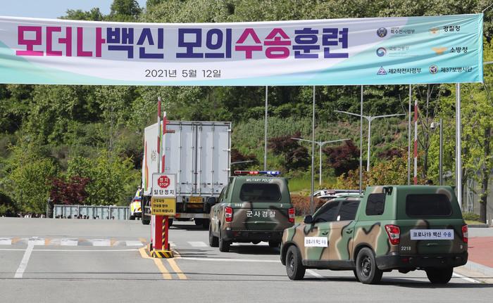 모더나 코로나19 백신이 식품의약품안전처의 첫 번째 전문가 자문 회의를 통과한 가운데 12일 오전 녹십자 오창공장에서 민·관·군이 합동으로 모더나 백신 모의 수송훈련을 하고 있다.