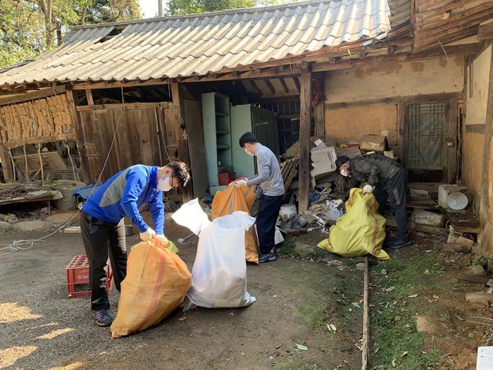 경기 김포시 시설관리공단은 최근 드림릴레이 취약계층 주거환경개선 봉사활동을 실시, 지역내 기초생활수급자가 거주하는 흙벽으로 지어진 노후 주택에 방문해 각종 쓰레기를 수거하고 폐가구를 폐기했다. 사진은 쓰레기를 수거하고 있는 모습. (사진제공=김포시청)