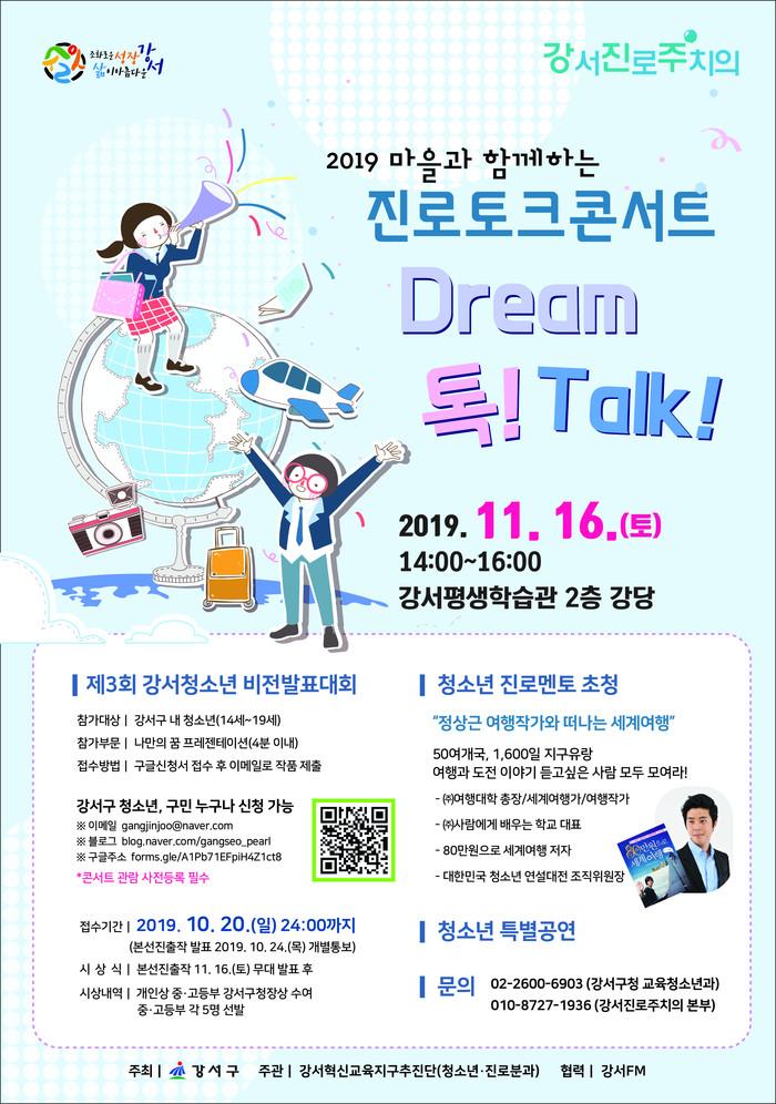 [시민일보 = 황혜빈 기자] 서울 강서구(구청장 노현송)는 오는 11월16일 개최되는 진로토크콘서트 ‘DREAM 톡! TALK!’에서 자신의 꿈을 발표할 청소년을 모집한다고 밝혔다.