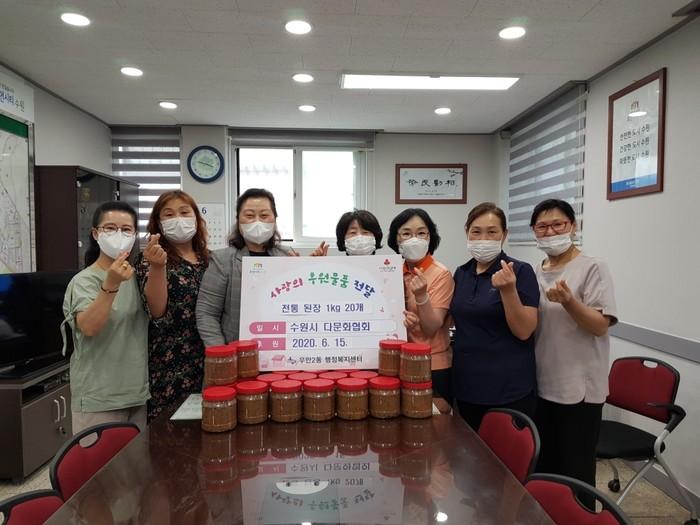 경기 수원시 다문화협회는 최근 팔달구 우만2동 취약계층을 위한 수제 전통된장 나눔 행사를 열었다. 사진은 나눔 행사에 참여한 회원들의 기념촬영 모습. (사진제공=팔달구청)