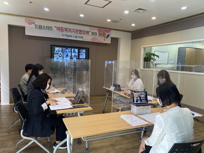 경기 하남시가 최근 드림스타트 프로그램실에서 화상회의를 통해 지역내 아동복지기관 관계자 12명이 참여한 가운데 아동복지기관협의체 회의를 개최했다. 이날 회의에서는 시 아동복지 관련 기관들이 모여 드림스타트 위기사례관리 대상자에 대한 통합 지원방안을 논의하고, 기관의 주요 사업에 대한 정보를 공유했다. 사진은 회의가 진행되고 있는 모습. (사진제공=하남시청)