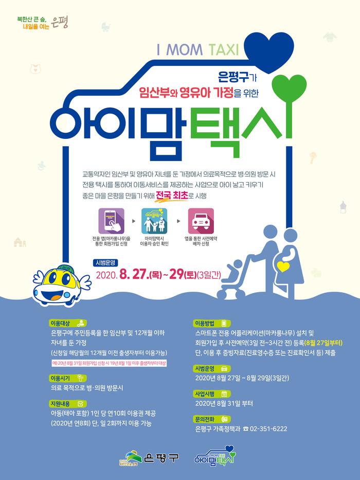[시민일보 = 이대우 기자] 서울 은평구(구청장 김미경)가 오는 27~29일 3일간 ‘아이맘택시’ 시범운영을 실시하고, 31일 본격적인 시행에 들어간다.