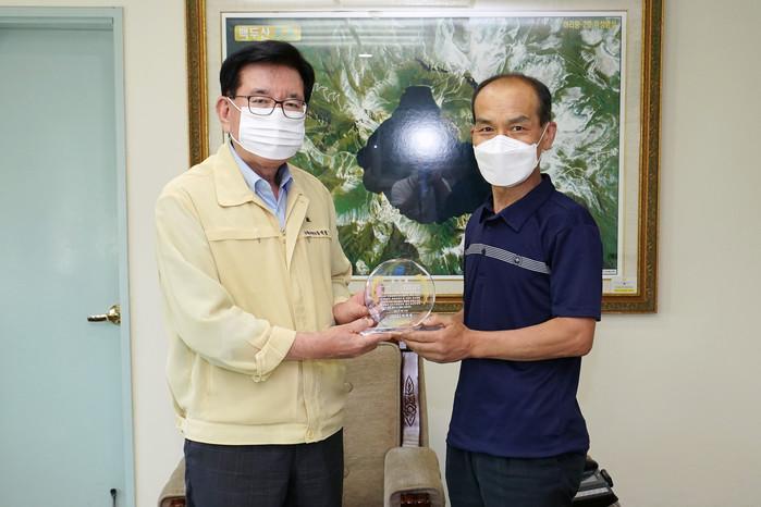 동대문구 18일 저소득 취약계층을 위한 복지서비스 실현에 이바지한 데 대한 감사의 마음을 전하고자 재생자전거 기증자인 사단법인 사랑의자전거 정호성 상임이사에게 감사패를 전달했다. 사진은 감사패 전달식에서 유덕열 구청장(왼쪽)이 정 이사와 기념촬영을 하고 있는 모습. (사진제공=동대문구청)