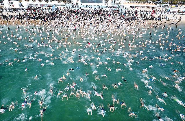 5일 부산 해운대해수욕장에서 열린 북극곰 수영축제에서 수영복을 입은 참가자들이 차가운 겨울 바다에 뛰어들고 있다. 올해로 33회째를 맞는 이번 행사에는 최소 4세부터 86세까지 ‘인간 북극곰’ 5000명이 참가했다. /연합뉴스