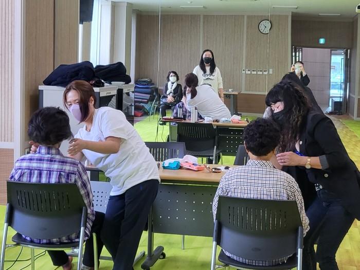 경기 포천시 소흘읍 주민자치위원회는 최근 저소득층 노인 70명의 건강과 장수를 기원하며 프로필 사진촬영 봉사를 실시했다. 사진은 봉사자들이 노인들에게 사진촬영에 앞서 메이크업을 해주고 있는 모습. (사진제공=포천시청)