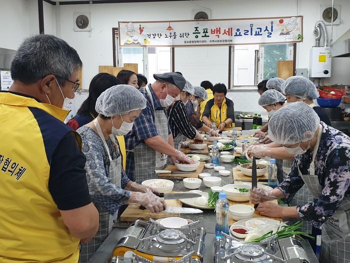 경기 이천시 증포동지역사회보장협의체가 주관하는 '건강한 노후를 위한 이천시 증포동 백세요리교실'이 25일 증포동행정복지센터내 다사랑관에서 지역내 65세 이상 노인을 대상으로 개최됐다. 사진은 이날 요리교실에서 노인들이 요리 실습을 하고 있는 모습. (사진제공=이천시청)