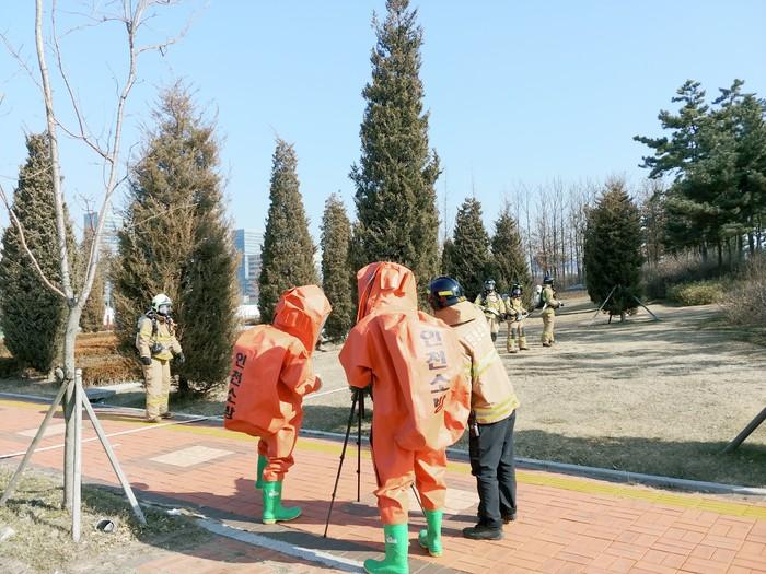 인천 송도소방서는 11일 현장 대응 출동체계 구축 및 현지 적응을 위해 소방차량 5대와 소방공무원 16명이 동원된 가운데 솔찬공원 앞 공터에서 ‘화학사고 대비 불시 출동훈련’을 했다. 사진은 소방공무원들이 훈련을 하는 모습. (사진제공=송도소방서)
