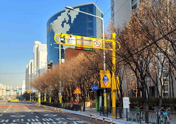 | ▲ 신도림초등학교 앞에 설치된 스마트 횡단보도. (사진제공=구로구청) |