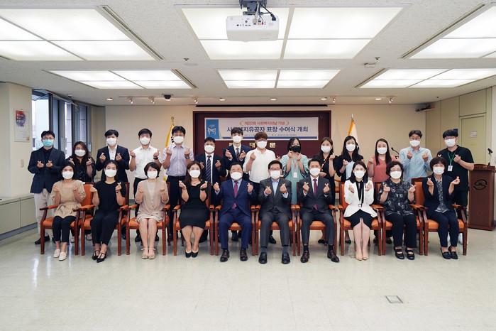 동대문구가 지난 7일 제22회 사회복지의날을 맞아 꾸준히 나눔 및 봉사를 실천한 후원자 및 봉사자 38명에 대해 표창을 수여했다. 사진은 표창 수여식에서 유덕열 구청장(앞줄 오른쪽 다섯 번째)과 표창 수여자 등이 기념촬영을 하고 있는 모습. (사진제공=동대문구청)