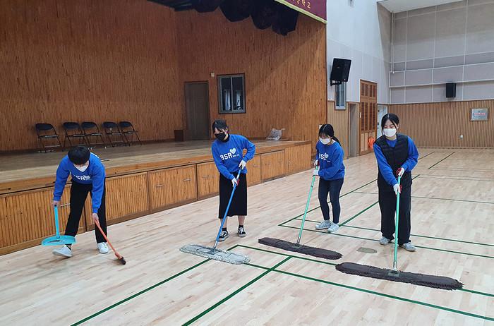 ▲ 체육관 바닥을 청소하고 있는 봉사단원들. (사진제공=bhc치킨) |