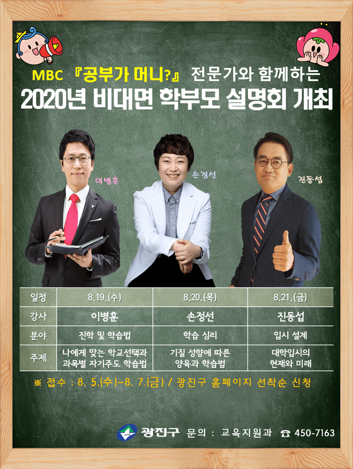 화상강의 참여자는 선착순 접수를 통해 1일 50명으로 제한하되 신청을 못한 학부모들을 위해 인원 제한이 없는 ‘광진구 공식 유튜브 채널’에서 실시간 라이브 방송을 병행한다.