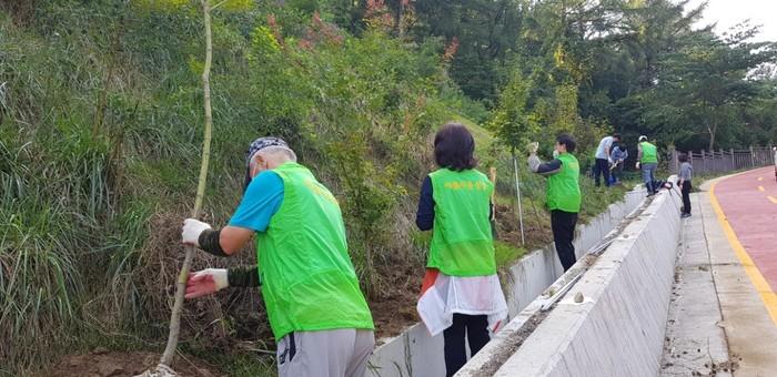경기 동두천시자원봉사센터 자원봉사단체인 '산길 봉사회'는 최근 왕방산 임도 오지재 고개 일원에서 '내나무 심기 행사'를 열어 단풍나무 80여그루를 심고 명찰을 부착하며 푸른숲 만들기에 동참했다. 사진은 이날 회원 및 참여자들과 함께 단풍나무를 식재하고 있는 모습.(사진제공=동두천시청)
