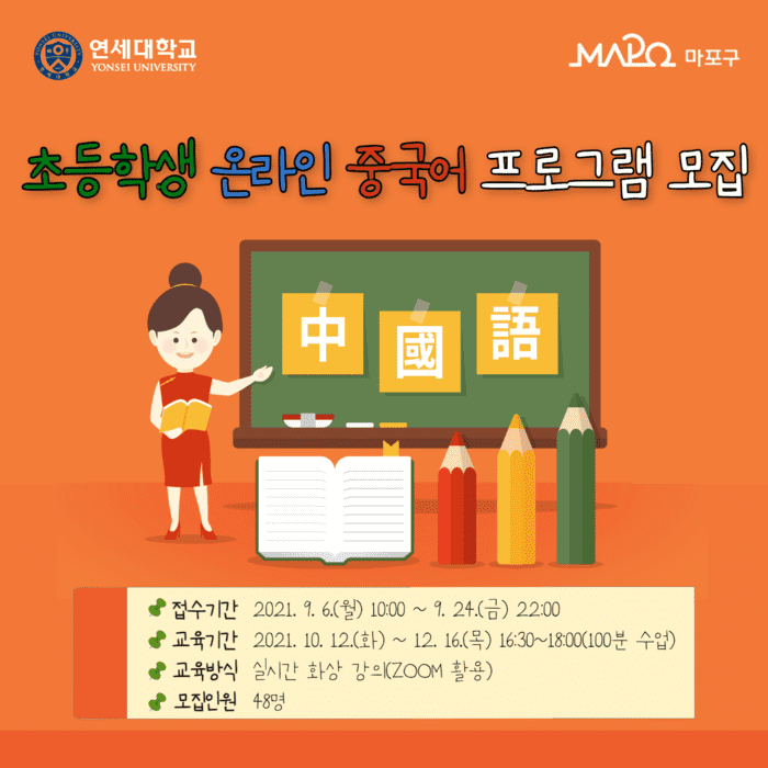[시민일보 = 홍덕표 기자] 서울 마포구(구청장 유동균)가 오는 10월12일부터 12월16일까지 '마포구-연세대학교가 함께하는 온라인 초등학생 중국어 프로그램'을 운영한다.