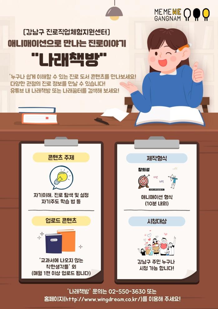 [시민일보 = 이대우 기자] 서울 강남구(구청장 정순균)가 ‘나래꿈터(나의 미래를 꿈꾸는 터전)’ 공식 유튜브 채널을 통해 청소년의 진로 탐색과 설계, 자기주도 학습법이 담긴 도서 콘텐츠를 소개하는 ‘나래책방’을 운영한다