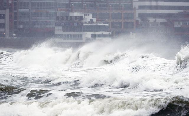 17 태풍 ‘타파’가 북상 중인 22 부산 해운대해수욕장 앞바다에서 거대한 파도가 강풍과 함께 해안으로 몰아치고 있다.
