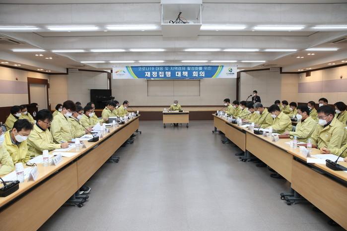 경기 이천시가 최근 권금섭 부시장 주재로 전간부공원이 참석한 가운데 코로나19 대응 및 지역경제 활성화를 위한 재정집행 대책 회의를 열고 재정집행 방향 및 계획을 공유하고 효율적인 대책 추진 방안 등에 대해 논의했다. 사진은 회의 진행 모습. (사진제공=이천시청)