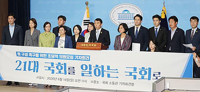 21대 국회 원 구성 촉구를 위한 초당적 의원모임’의 더불어민주당, 열린민주당, 기본소득당 초선의원들이 14일 오전 서울 여의도 국회 소통관에서 21대 국회 원 구성 촉구 기자회견을 하고 있다.