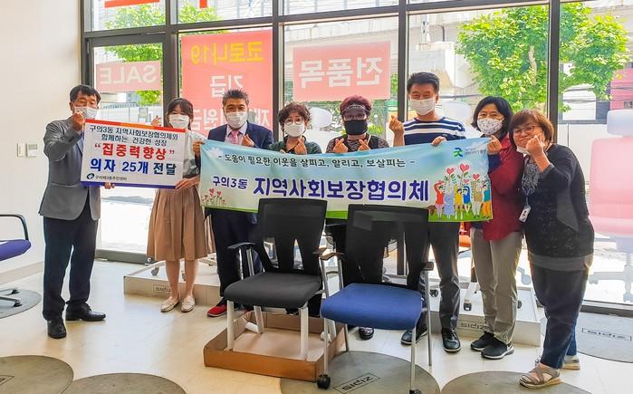 서울 광진구가 9일 구의3동 지역사회보장협의체와 함께 구의3동에 거주하는 취약계층 고등학생 25명에게 학습용 의자를 전달했다. 전달식에 참여한 관계자들이 기념촬영을 하는 모습. (사진제공=광진구청)