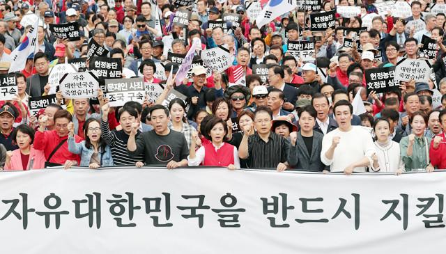 황교안 대표와 나경원 원내대표가 21 오후 서울 광화문 세종문화회관에서 열린 ‘문재인 정권 헌정 유린 중단과 위선자 조국 파면 촉구’ 대규모 장외집회를 마친 참가자들과 함께 청와대 방향으로 행진하고 있다.