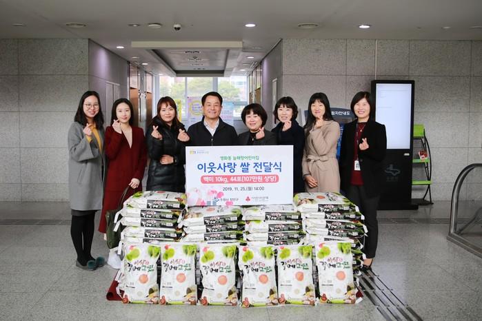 경기 수원시 장안구는 25일 영화동 소재 늘해랑어린이집으로부터 백미(10kg) 44포를 기부 받아 어려운 이웃에게 전달했다. 사진은 전달식에 참여한 관계자들이 기념촬영을 하는 모습. (사진제공=장안구청)
