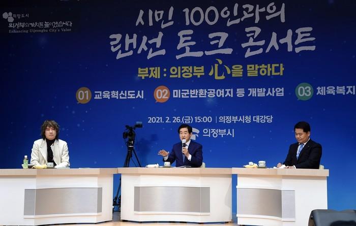 경기 의정부시는 최근 교육혁신도시·미군반환공여지 개발사업·체육복지 등 3개의 세션으로 '시민 100인과의 랜선 토크 콘서트'를 개최하고 유튜브와 TV로 생중계했다. 콘서트에서는 세션별 전문가 토론 및 질의응답이 진행됐다. 사진은 이날 안병용 시장(가운데)이 발언을 하는 모습. (사진제공=의정부시청)