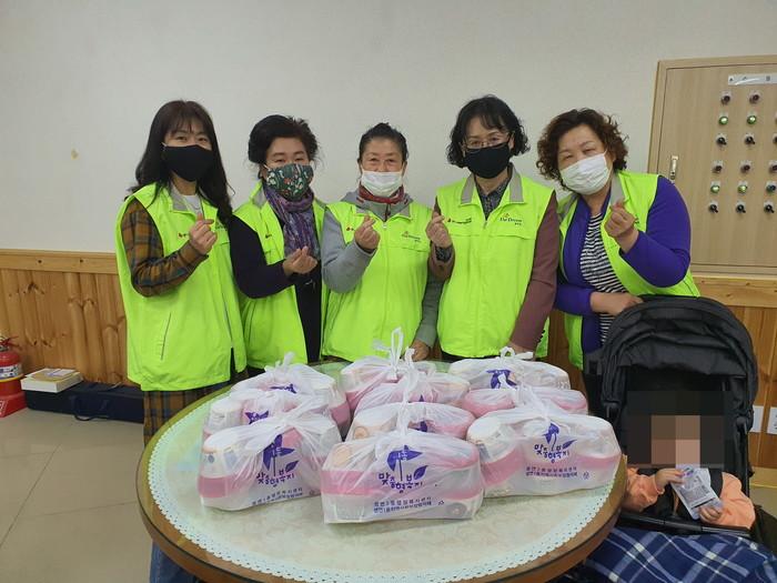 경기 동두천시 생연1동 지역사회보장협의체는 27일 지역내 저소득층 홀몸노인 10가구를 방문해 영양죽을 전달했다. 사진은 협의체 관계자들이 죽을 전달한 후 기념촬영을 하는 모습. (사진제공=동두천시청)