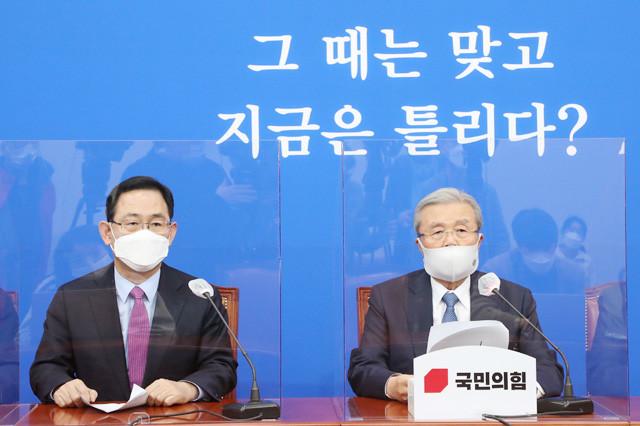 국민의힘 김종인 비상대책위원장이 1일 국회에서 열린 민주당 ‘손바닥 뒤집기’ 몰염치 공천 규탄 긴급기자간담회에서 발언하고 있다. /연합뉴스