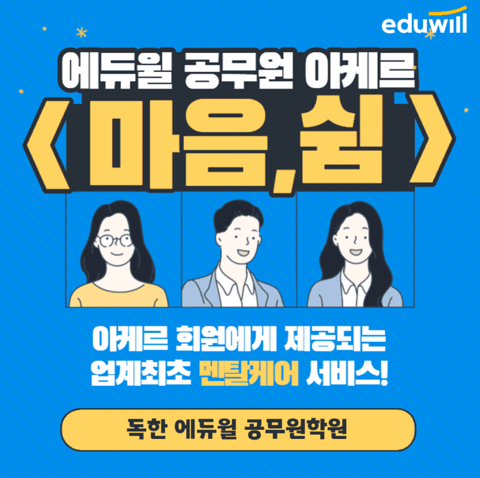 [시민일보 = 여영준 기자] 종합교육기업 에듀윌(대표 박명규)은 독한 에듀윌 공무원학원의 수강생들을 위해 업계 최초로 멘탈 케어 서비스를 제공하고 있다고 밝혔다.