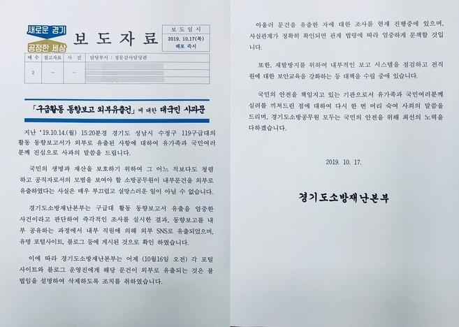 이에 경기도소방재난본부는 오늘 긴급 기자회견을 통해 보고서 유출과정을 브리핑하는 등 이번 사건으로 인해 "국민께 진심으로 사과한다"고 전했다.