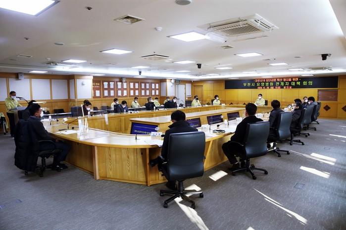 경기 부천시가 최근 지역내 요양병원의 코로나19 집단감염이 발생함에 따라 양일간에 걸쳐 관계자 회의를 열고 예방 및 확산 방지 대책을 논의했다. 회의는 장덕척 시장 주재로 지역내 대형병원 전문가와 요양병원 관계자 및 시 방역당국 관계자 등 30여명이 참여한 가운데 진행됐다. 사진은 장 시장이 회의를 주재하는 모습. (사진제공=부천시청)