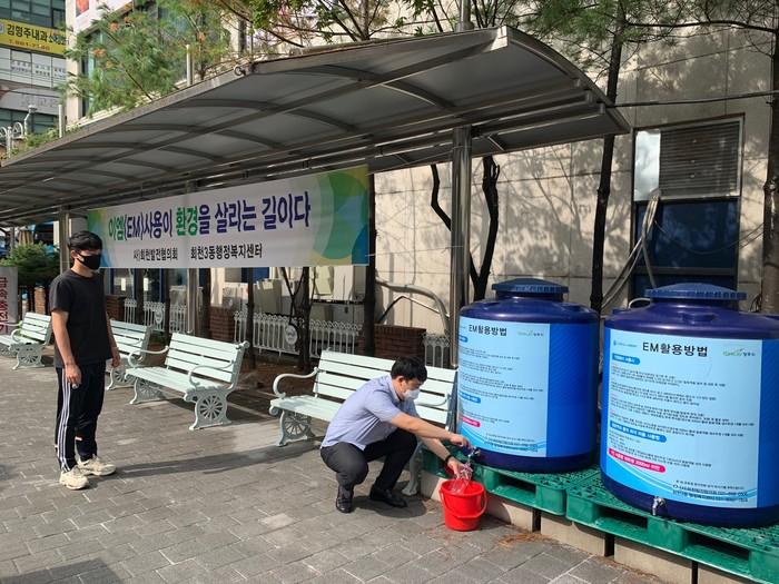 경기 양주시 회천3동행정복지센터가 친환경 유용미생물(EM) 발효액 무인공급기를 센터 옆 어울림마당에 설치했다. EM 발효액은 유용한 미생물군 80여종을 조합 배양한 미생물 처리제로 실생활에서 다용도로 사용할 수 있다. 사진은 주민들이 무인공급기에서 EM 발효액을 가져가는 모습. (사진제공=양주시청)