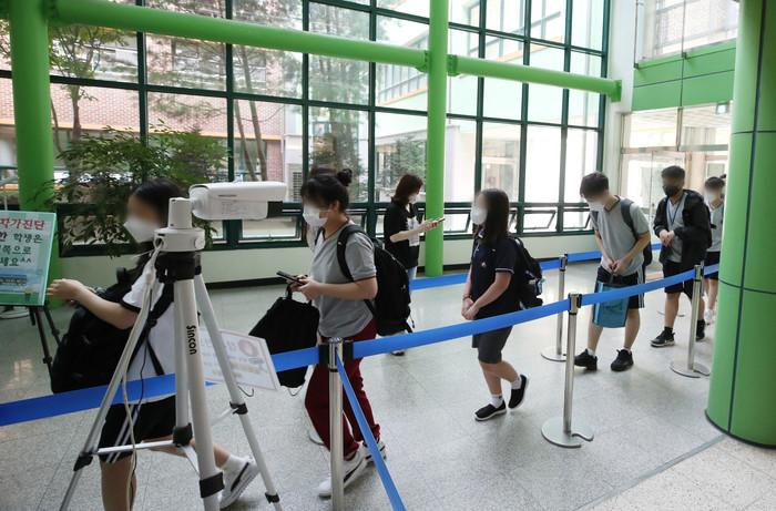 수도권 중학교의 등교수업이 확대된 14일 오전 경기 수원시 권선구 화홍중학교에서 학생들이 등교하고 있다. 교육부는 이날부터 현행 사회적 거리두기 2단계에서의 학교 밀집도 기준이 기존 3분의 1에서 3분의 2로 조정된다고 밝혔다.