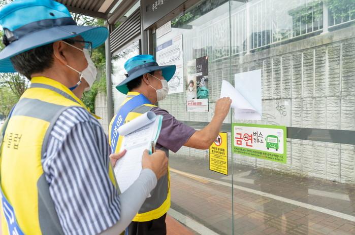 서울 양천구 시니어클럽 주관으로 진행하는 ‘행복정류장 사업’은 지역내 버스정류장의 안전과 청결을 유지하고, 주민불편을 줄이기 위해 버스정보안내시스템(BIT) 점검·정류장내 적치물과 불법부착물 제거 등을 실시한다. 사진은 사업 참여 노인이 지난 21일 구내 버스정류장에서 불법부착물을 제거하고 있는 모습. (사진제공=양천구청)