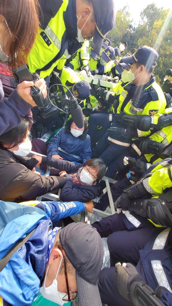 22일 경북 성주 초전면 소성리 진밭교에서 주민과 경찰이 충돌하고 있다. 이날 국방부는 성주 사드(THAAD·고고도미사일방어체계) 기지에 공사 장비 반입을 예고했다.
